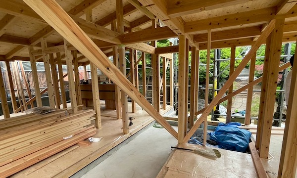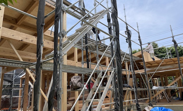 大工さんたちの作業が早すぎた。家の周りの道幅が狭い&平屋なので、クレーンなどの機械は使わずに手作業で木材をあげてくださったようです。